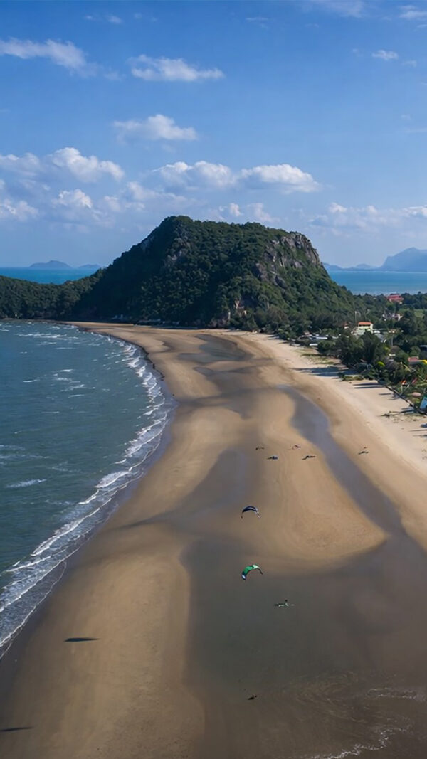 Serene beachfront in Thailand’s reliable wind spot—steady NE monsoon and thermal breezes, with tropical calm for nomads and holidays.